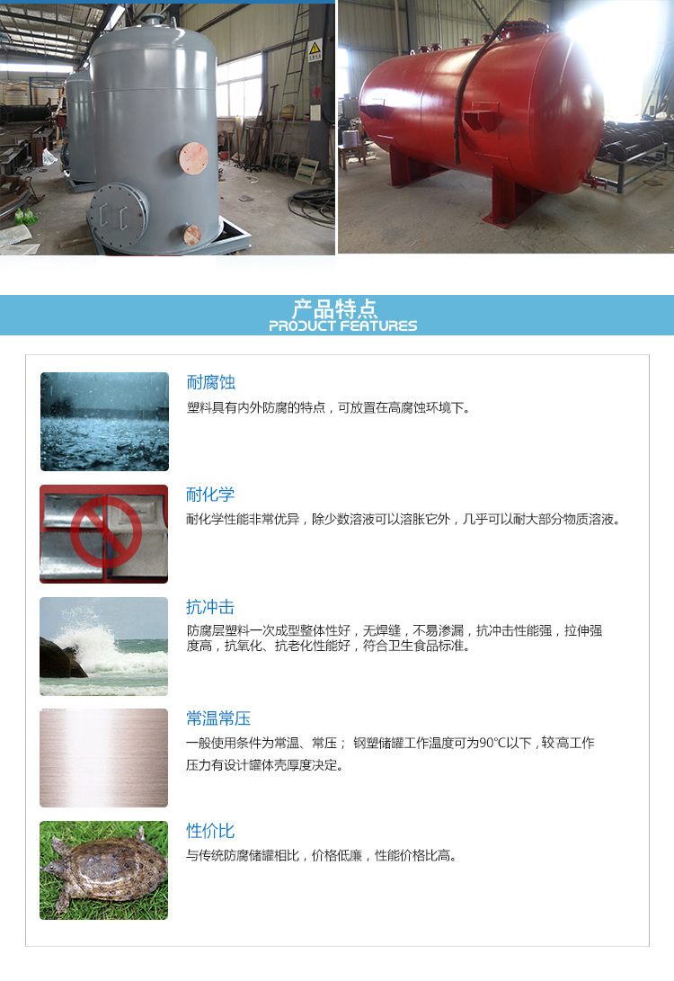 產(chǎn)品優(yōu)勢:我公司全塑及鋼襯塑產(chǎn)品既具有整體一次成型無焊接縫,外形平整光滑,抗沖擊,維修方便、耐高低溫,抗老化,不滲漏、耐酸、堿、鹽,壽命長、符合衛(wèi)生標準等優(yōu)點,使用性能優(yōu)于傳統(tǒng)的玻璃鋼、PVC等!